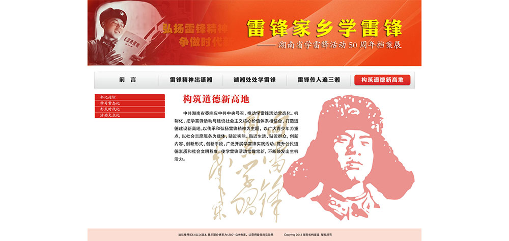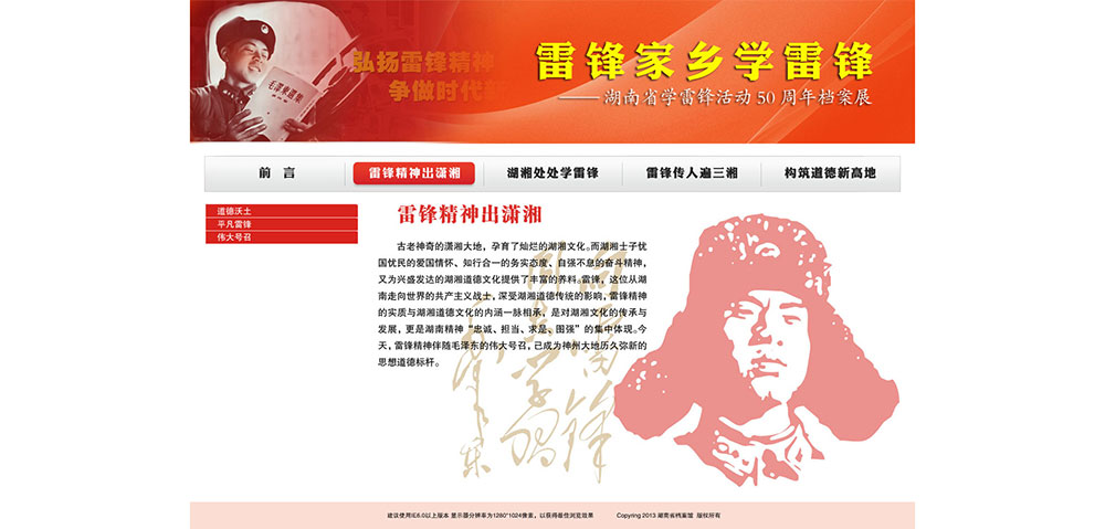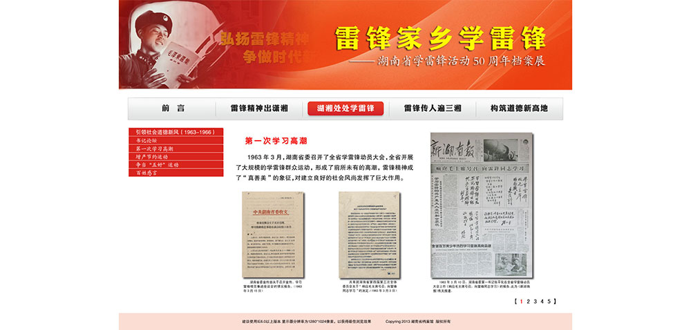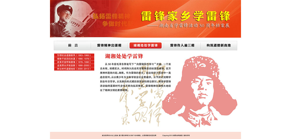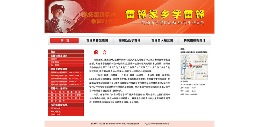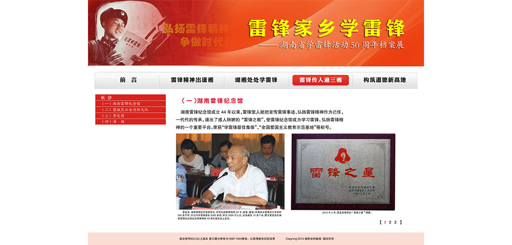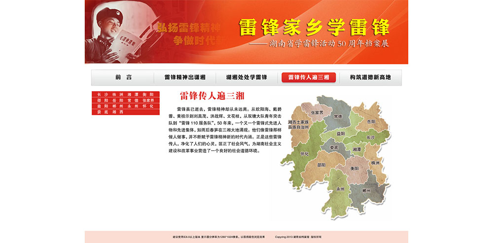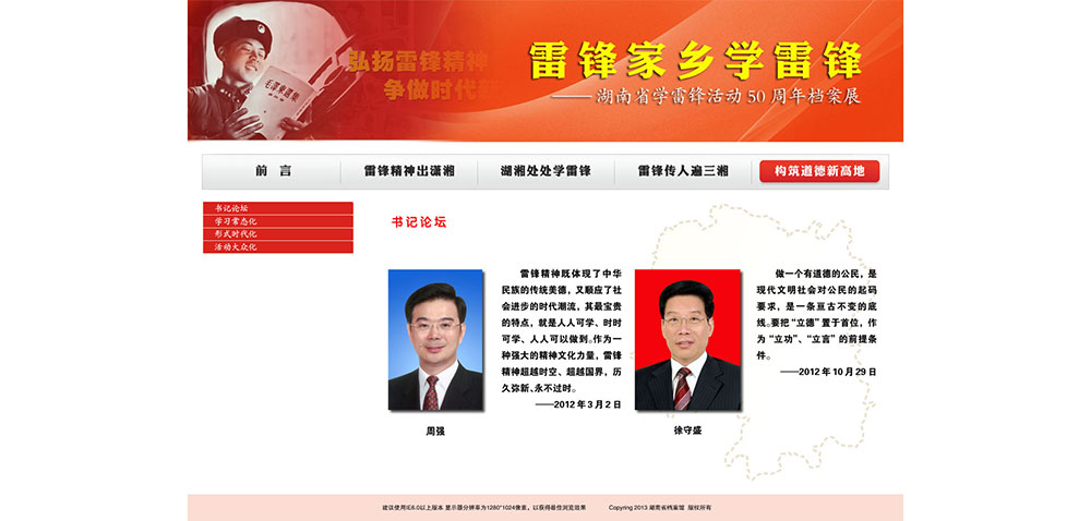 雷锋家乡学雷锋——湖南省学雷锋活动50周年档案展”在省档案馆开展。省委常委、省委宣传部部长许又声,副省长李友志参观了展览。此次展览由省档案局主办,以“雷锋家乡学雷锋”为主题,以展示档案原件和实物为基本定位,以档案的唯 一性与原始性真实反映历史,从中央档案馆、全省各级各类档案馆(室)选定了很能反映我省学雷锋活动特点的档案217件、照片196幅、实物78件入展,全面回顾与展示了我省50年来学雷锋活动的发展情况和历史概貌,旨在为我省传播雷锋精神打造一个新的平台,助推我省学雷锋活动深入开展。