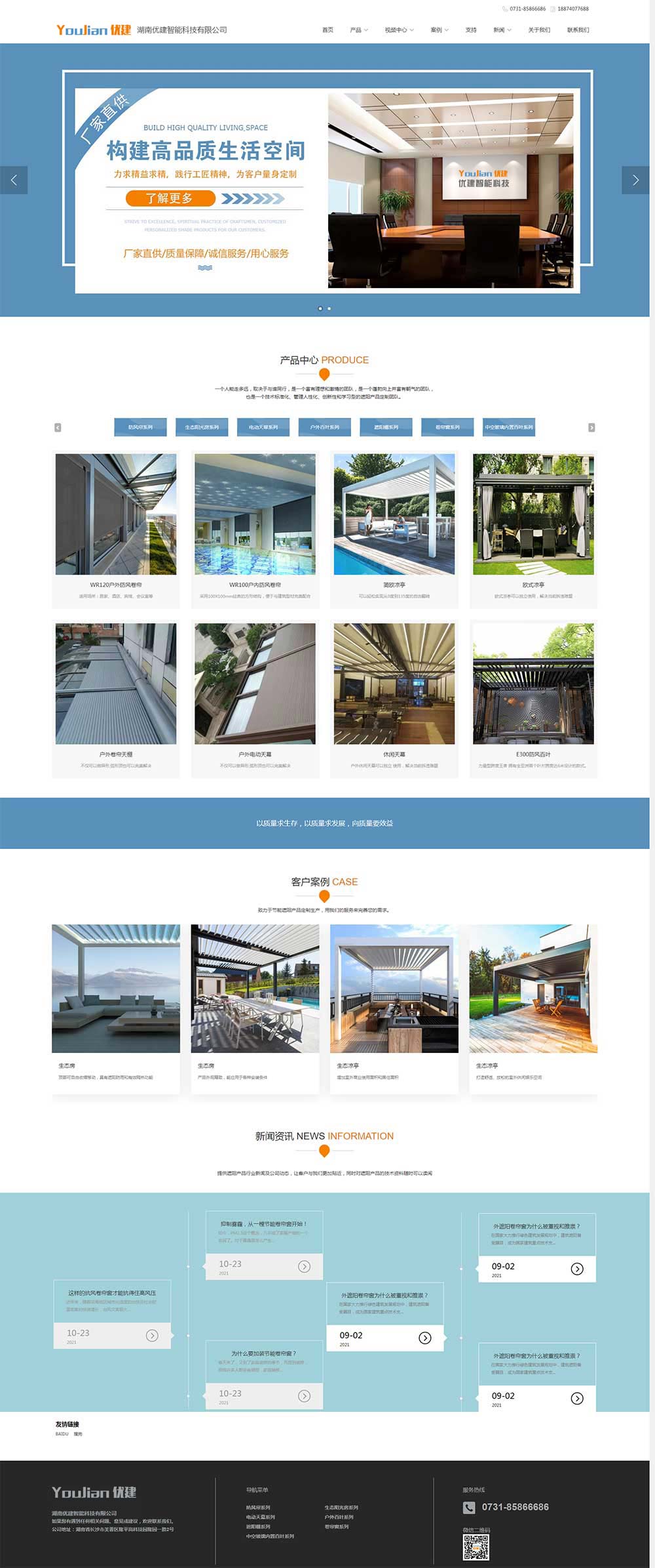 湖南优建智能科技有限公司是一家集建筑节能、遮阳、装饰材料、金属门窗的开发、设计、生产、销售、安装于一体的创新型建筑遮阳企业。我们致力于为客户构建惬意、舒适、节能的高品质生活空间。主营产品包括:防风卷帘、户外防水百叶、卷帘门窗、遮阳棚、中空内置百叶、遮阳布艺等,有多种控制方式供不同的应用场景选择。